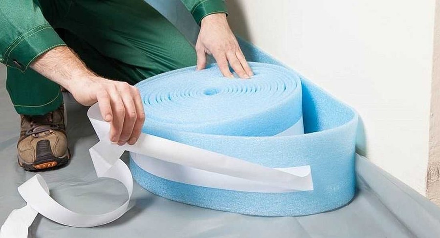 - Демпферна стрічка, укріплена по периметру стіни, компенсує вібрацію підлоги до стін. Її клеять таким чином, щоб після заливання виступав край 2 см.