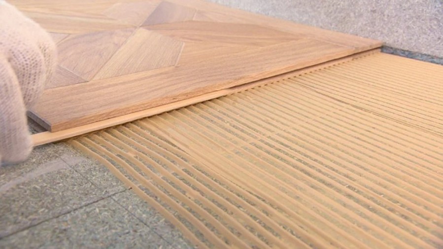 Перед укладанням покриття для підлоги рекомендовано звільнити дошки від упаковки і дати їм адаптуватися до клімату приміщення протягом доби. Клей вибирається згідно способу укладання – на фанеру потрібен склад помірної фіксації, для бетону – сильної. Не потрібно відразу розводити велику кількість, особливо якщо не вистачає досвіду. Склади, як і суміш, що вирівнює, вимагають дозрівання в пластиковій ємності.