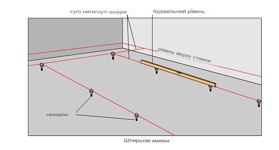 - Відбивають нульовий рівень підлоги нівеліром і виставляють бажану висоту. Крім маяків, на підлогу укладають сітку для міцності. Її важливо встановити на окремі опори, щоб суміш схопила її знизу та зверху.
