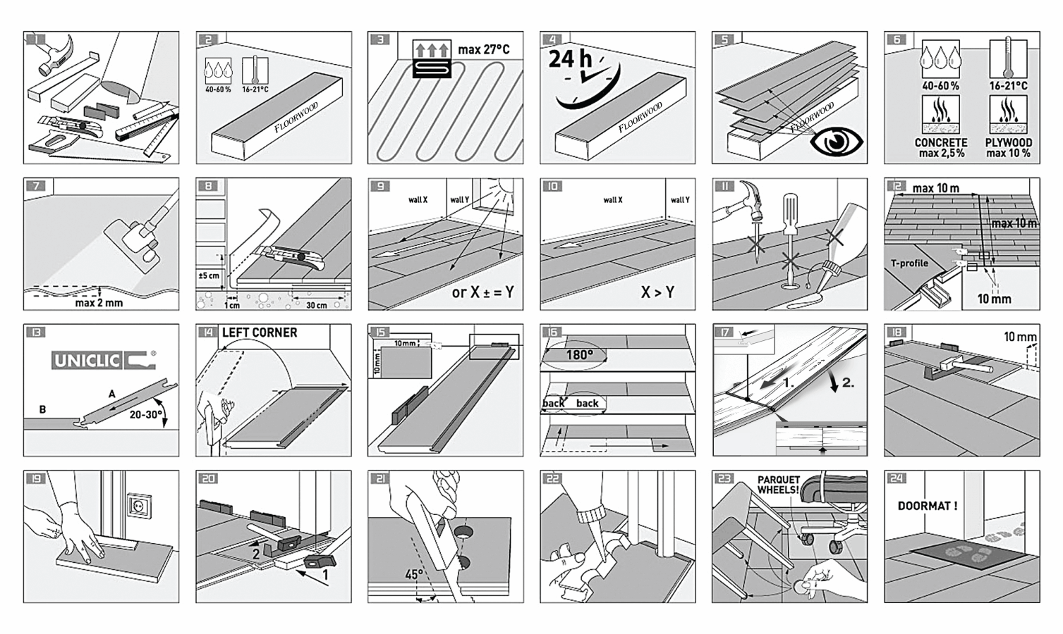 - Перед укладанням ламінат щонайменше добу зберігається в приміщенні, в якому заплановано його монтаж.